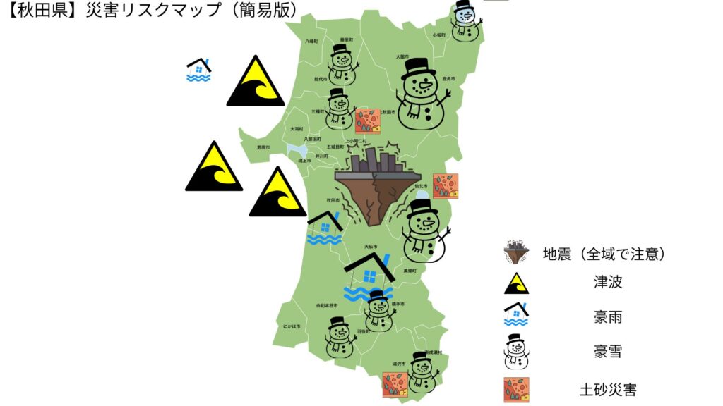 【重要】 秋田県全域で地震と豪雪のリスクがあります。沿岸部では津波、平野部では河川氾濫。全市町村で備えが必須です。