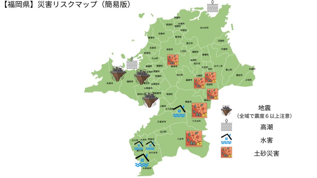 【重要】 福岡県全域で地震のリスクがあります。特に警固断層帯周辺では震度7、沿岸部では高潮、山間部では土砂災害。全市町村で備えが必須です。