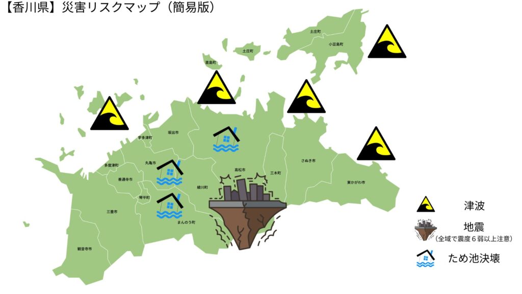 | 宇多津町 | 🟠 震度6弱想定 | 🟡 注意 | 🟡 注意 | – | 地震+津波 |
