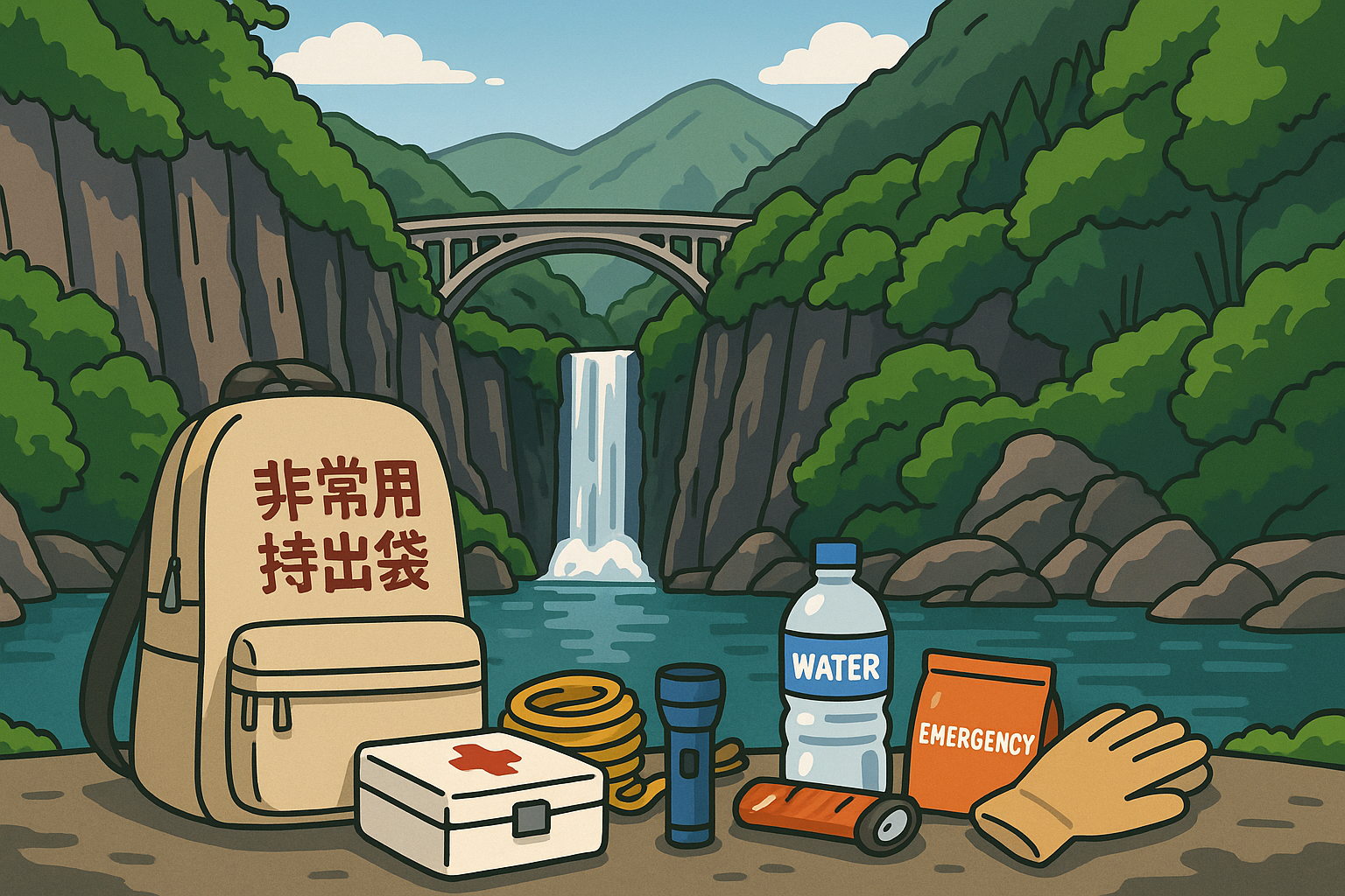 非常持ち出し袋、懐中電灯、ホイッスル、ライフジャケット(沿岸部)など。