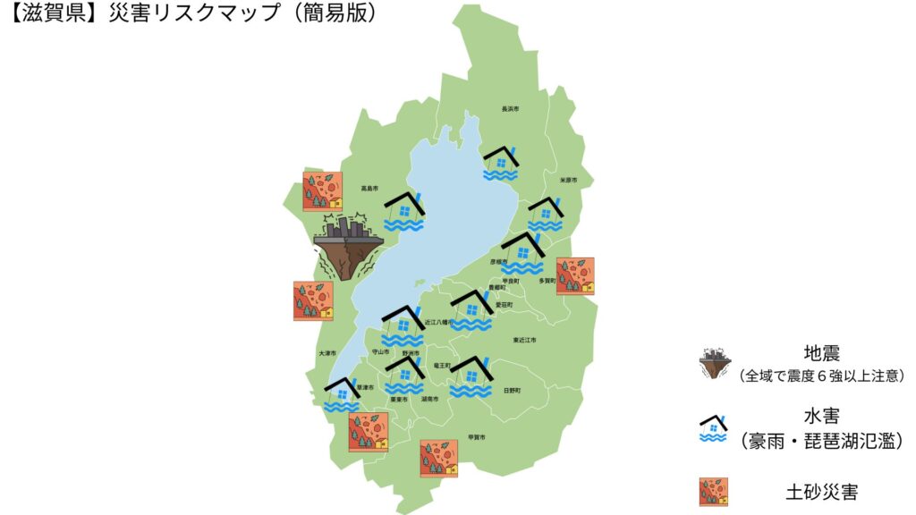 【重要】 滋賀県全域で地震のリスクがあります。特に琵琶湖西岸断層帯周辺では震度7、琵琶湖沿岸部では琵琶湖水位上昇、河川流域では河川氾濫、山間部では土砂災害。全市町で備えが求められます。