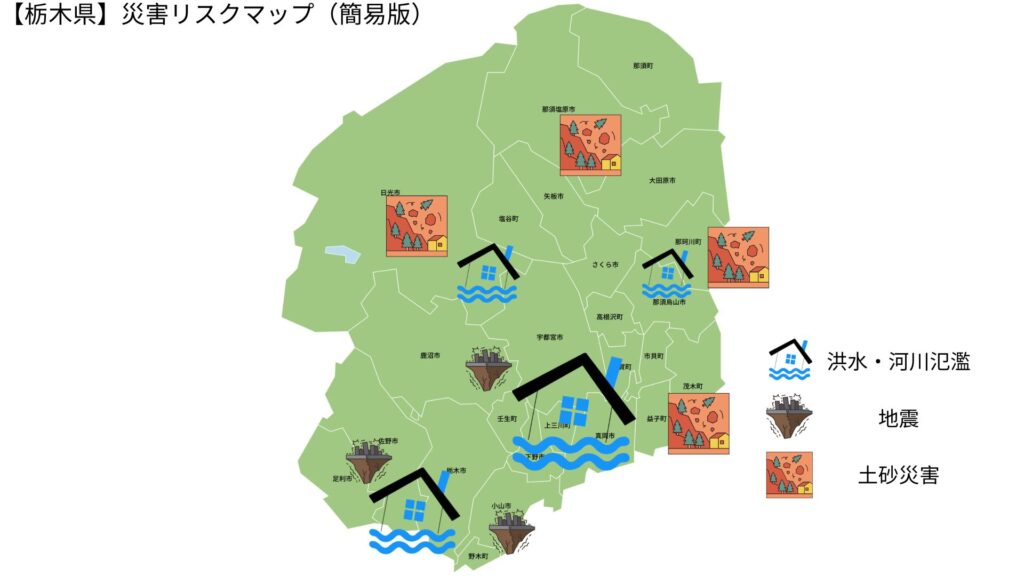 | 🌍 地震(内陸型・首都直下型影響) | 活断層が多く、突然の強い揺れへの備えが必要 | 県全域(特に宇都宮市・小山市・佐野市) |