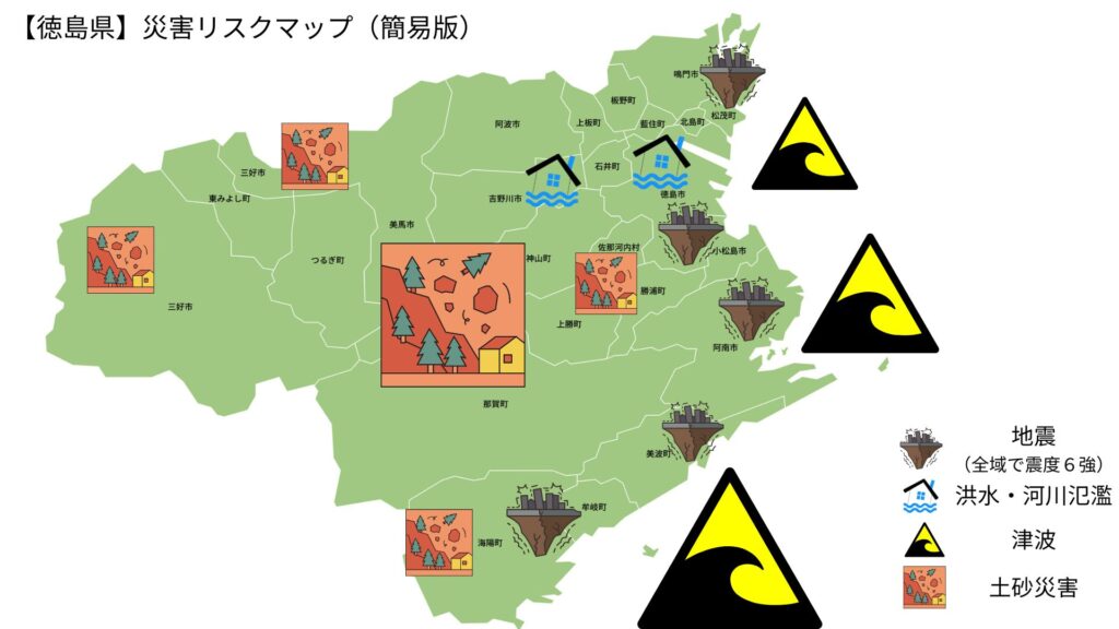 【重要】 徳島県全域で南海トラフ巨大地震のリスクがあります。沿岸部では日本最大級の津波、山間部では土砂災害。全市町村で最高レベルの備えが必須です。