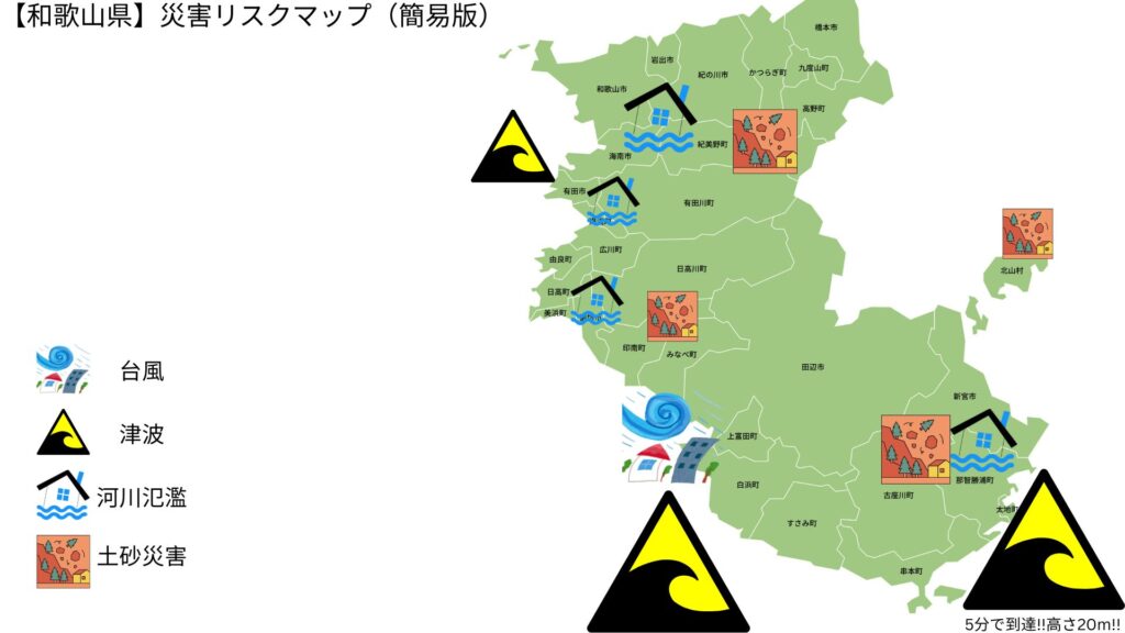 ※ここに和歌山県地図+ピクトグラム画像を配置 ※Alt属性:「和歌山県の災害リスクマップ。津波・豪雨・土砂災害を市町村別に色分けした地図」